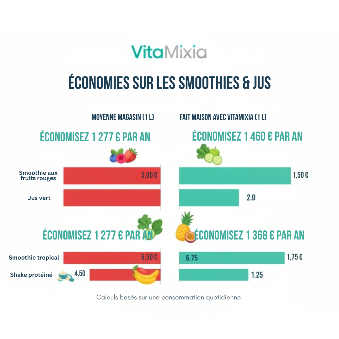 Pourquoi dépenser plus pour du lait végétal industriel ? VitaMixia vous permet d'obtenir tout le plaisir et l'onctuosité du lait végétal fait maison... avec des ingrédients que vous choisissez vous-même, sans additifs ni gaspillage. Chaque fois que vous versez une nouvelle boisson, vous faites des économies par rapport aux alternatives prêtes à l'emploi et vous offrez à vous-même (et à votre famille) un choix sain, pratique et transparent.